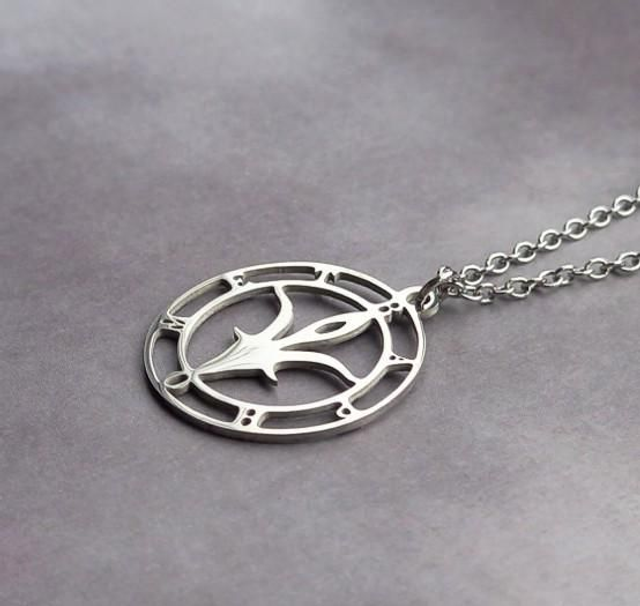 The circular design is 2.5cm in diameter. It is attached to a steel jumpring and threaded onto steel chain. It fastens with a lobster clasp.