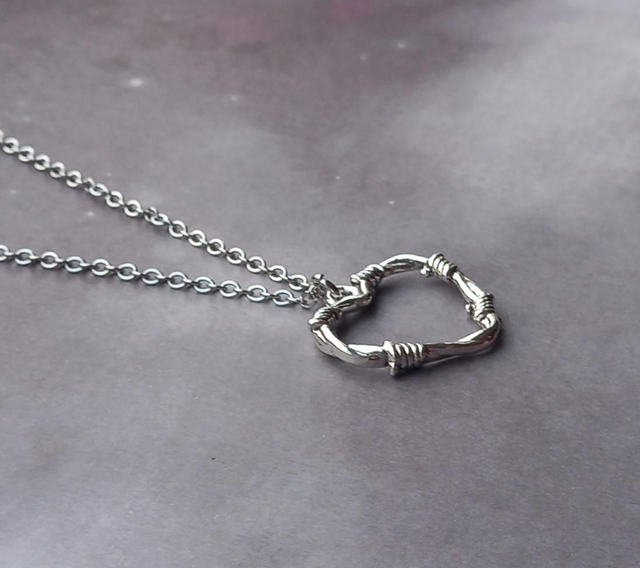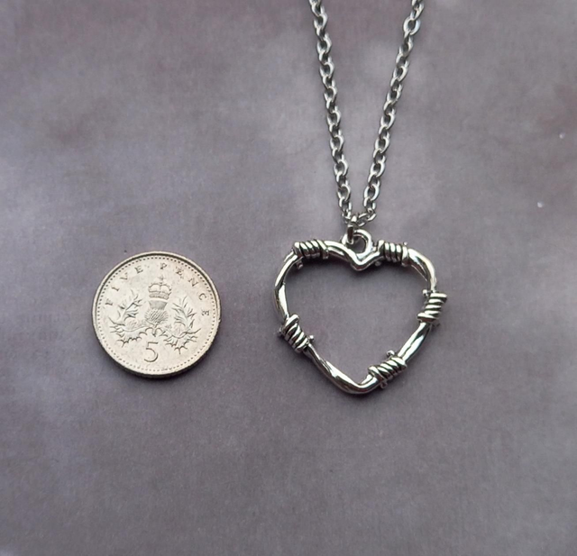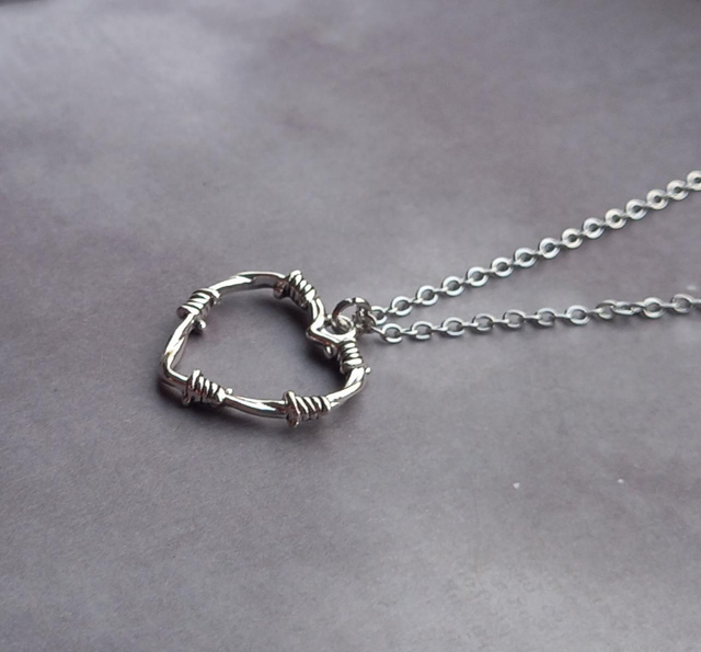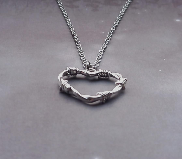 Barbed wire metal heart necklace.