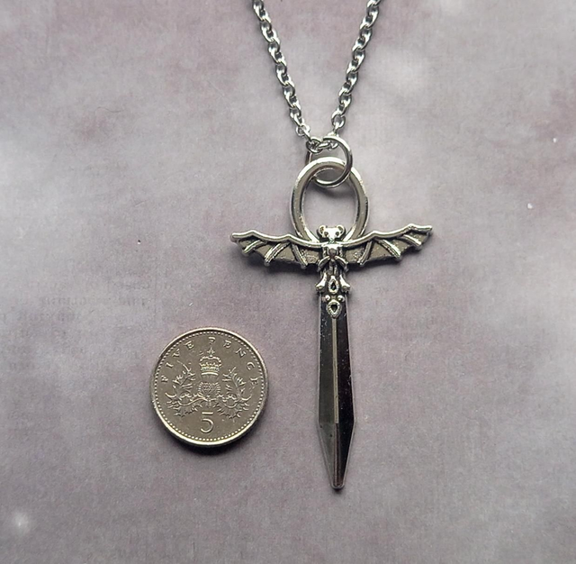 Metal bat cross necklace.