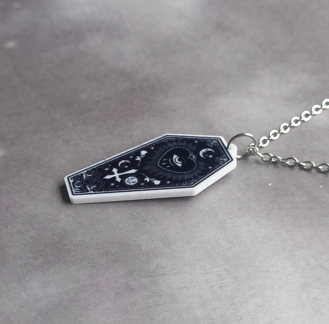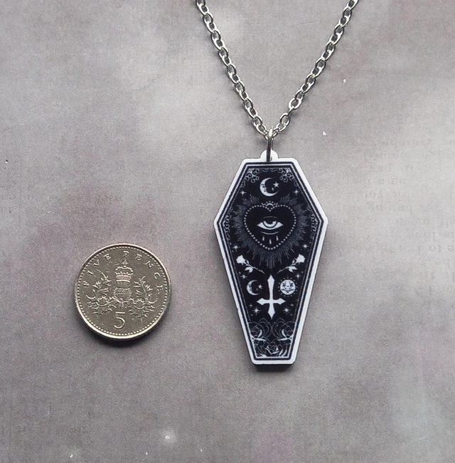 The coffin design is double sided, and is approximately 2cm wide and 4cm high. It is attached to a jumpring, and hung from a steel trace chain. It fastens with a lobster clasp.