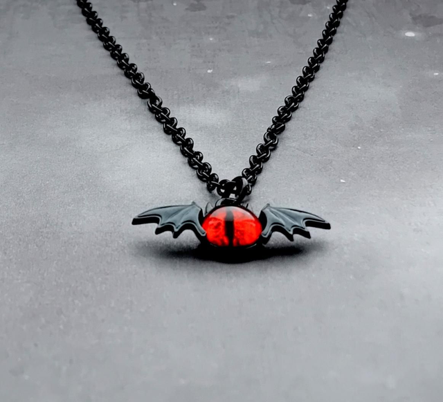 The bat is black plated metal alloy, approximately 2.5cm wide and 1cm high. It is attached to a jumpring and hung from a black plated chain.
