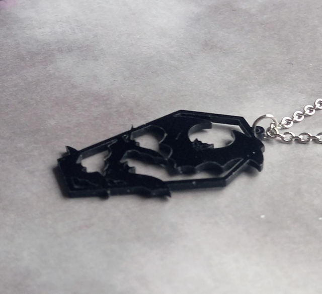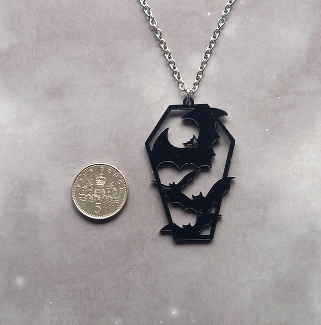 Black acrylic coffin necklace filled with bats.