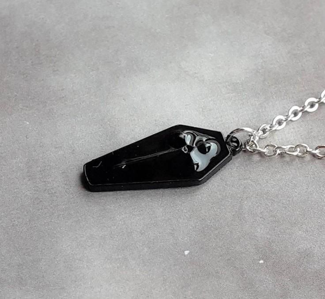 Black metal coffin necklace.