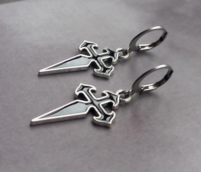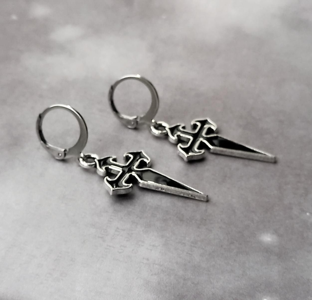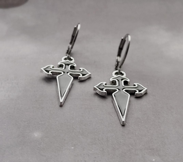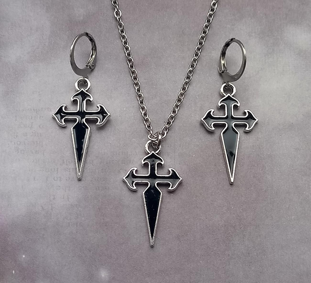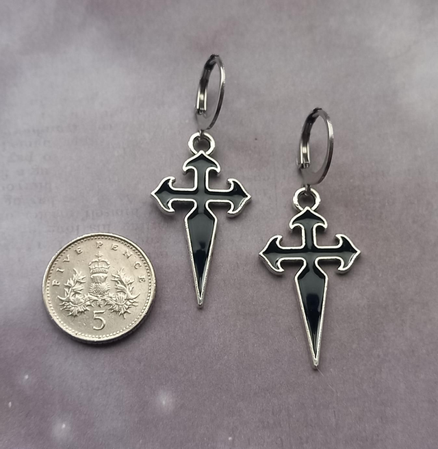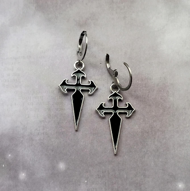 Gothic cross metal earrings with black enamel detail.