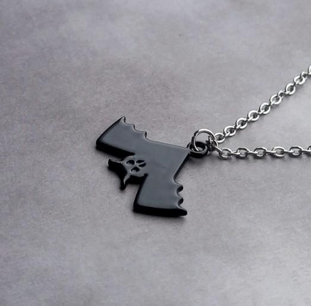The bat is black plated metal alloy, approximately 3cm wide and 2cm high. It is attached to a steel jumping and hung from a stainless steel chain.