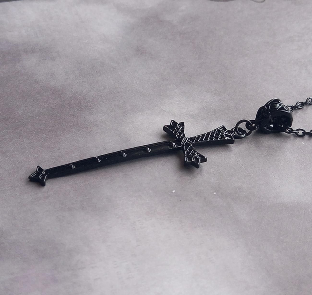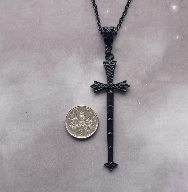 The cross is black plated metal alloy, just over 2cm wide and 6.5cm high. It is attached to a black patterned bail and hung from a black plated stainless steel chain.