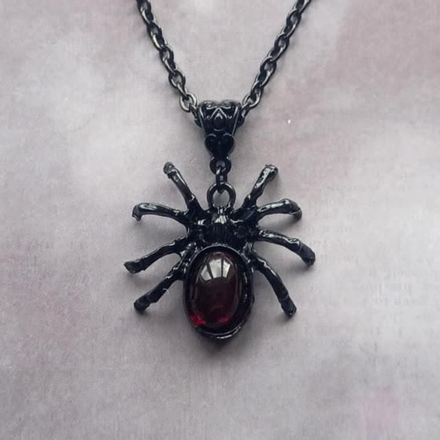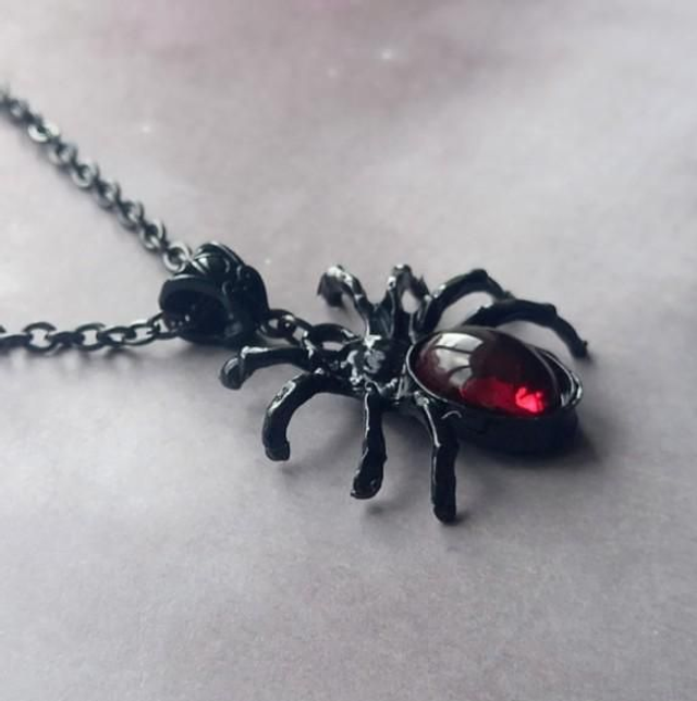 Large black metal spider necklace with red body.