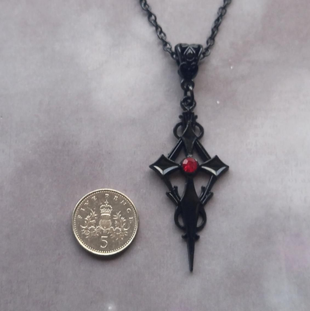 Black vampire cross necklace with red stone. This is the smaller version of this style.