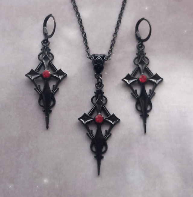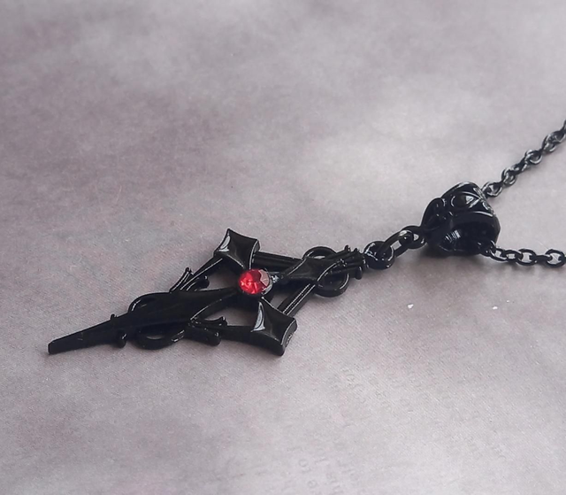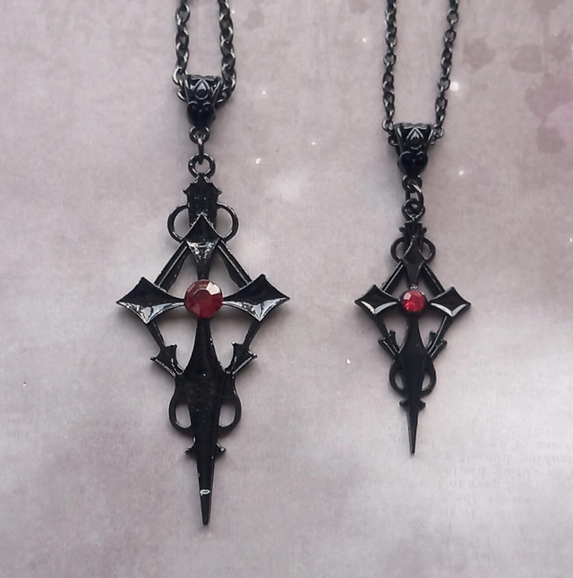 Black vampire cross necklace with red stone. This is the smaller version of this style.