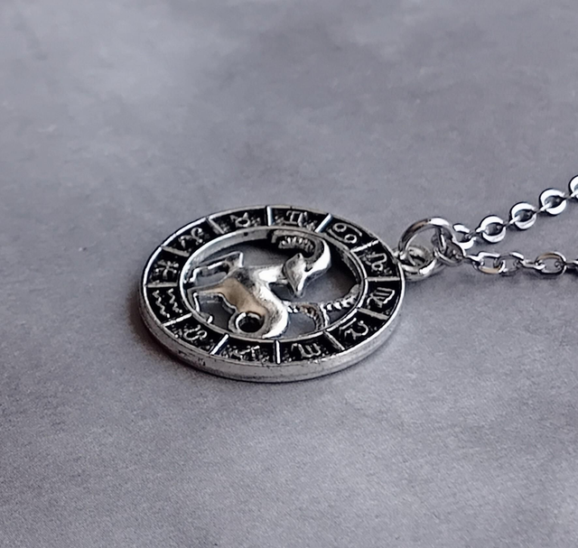 The circle is silver plated metal alloy, approximately 2cm in diameter. It is attached to a steel jumpring and hung from a stainless steel chain.