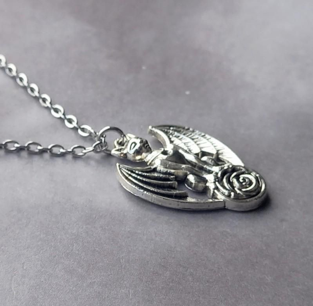 The pendant is made from silver plated metal alloy, and is approximately 2cm wide and 2.5cm high. It is attached to a jumpring, and hung from a stainless steel trace chain.