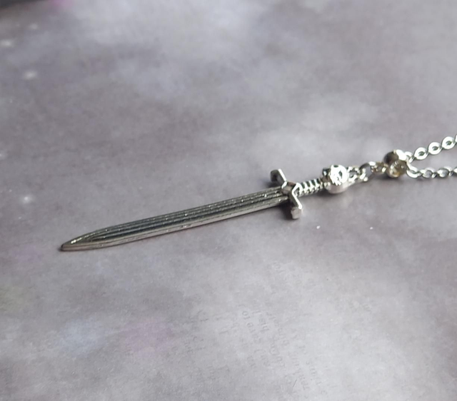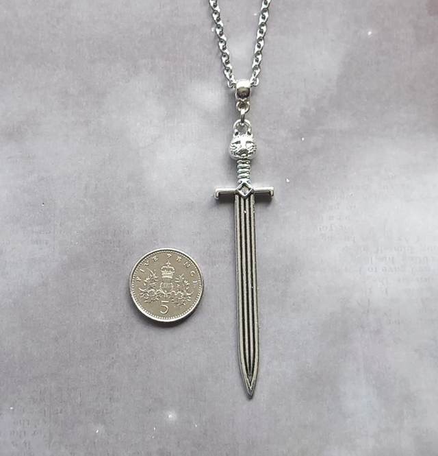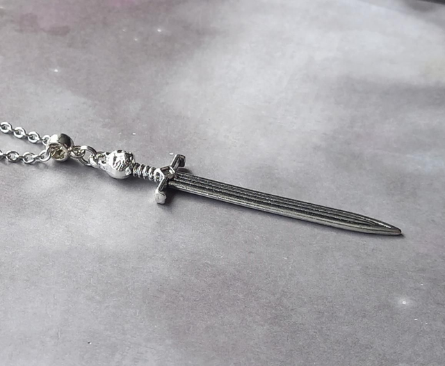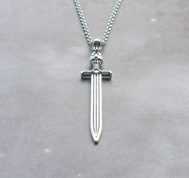 The sword is silver plated metal alloy, approximately 1.5cm wide and 6.5cm long. It is attached to a simple silver plated bail, and hung from a stainless steel chain.
