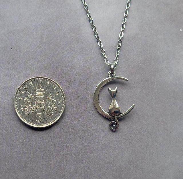 The moon and cat are silver plated metal alloy, approximately 1.5cm wide and 2cm high. They are attached to a steel jumpring, and hung from a stainless steel chain.