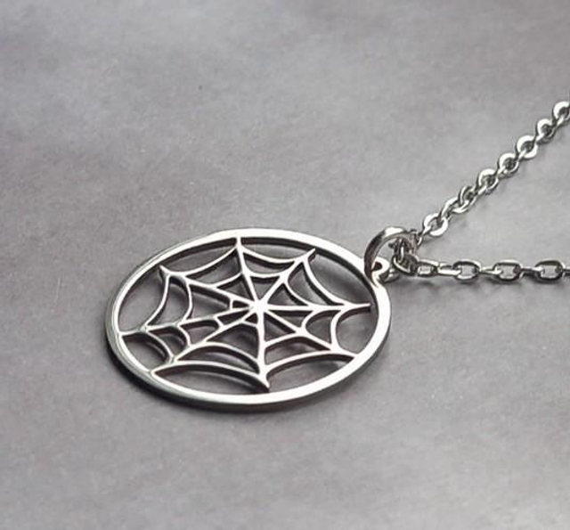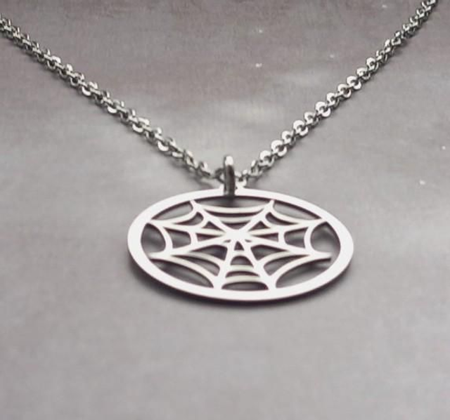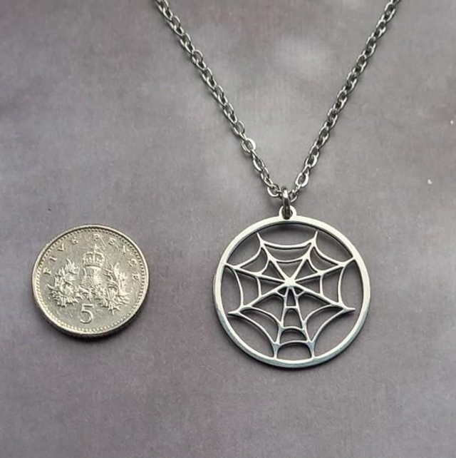 The web is stainless steel, approximately 2.5cm in diameter. It is attached to a steel jumpring, and hung from a stainless steel chain.