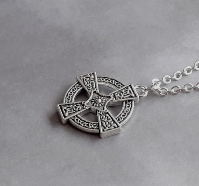 The cross is silver plated metal alloy, and is 2cm wide. Iis attached to a steel jumpring and hung from a stainless steel chain.