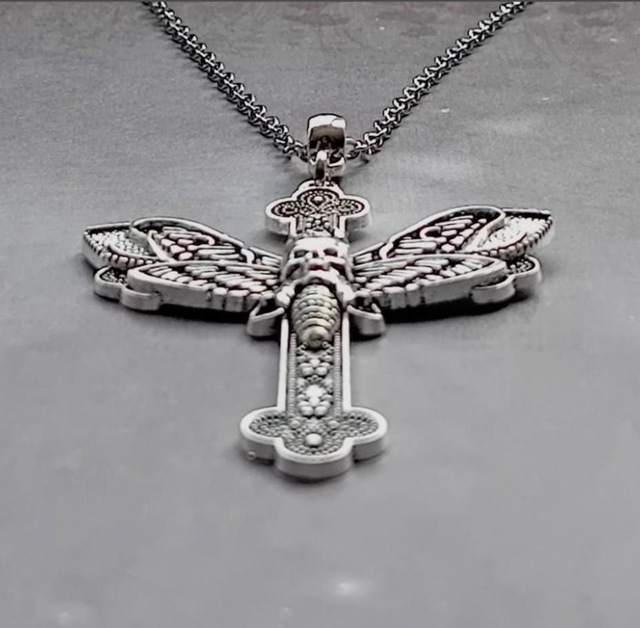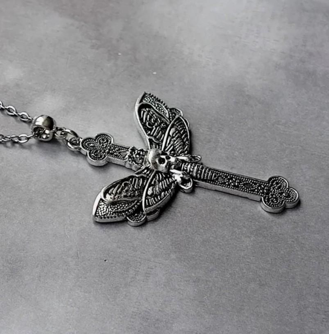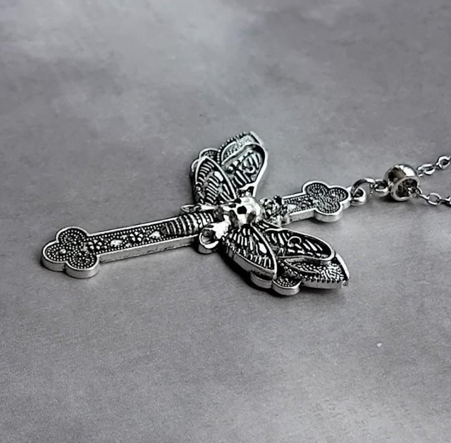 Patterned metal cross necklace with a death's head moth stretched out over the cross.