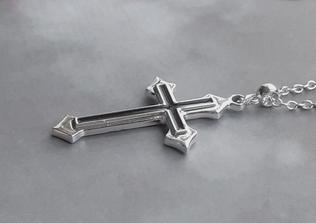 The cross is silver plated metal alloy, approximately 3cm wide and 5cm long. The base cross has shaped arms, and is overlaid with a black enamel cross. It is attached to a simple silver plated bail, and hung from a stainless steel chain.