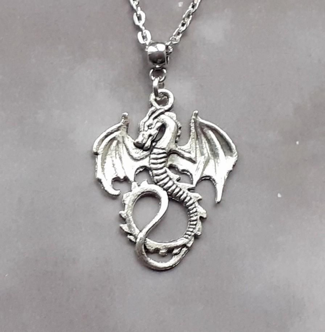 The dragon is silver plated metal alloy, approximately 2.75cm wide and 3.5cm long. It is attached a silver plated bail, and hung from a stainless steel trace chain.