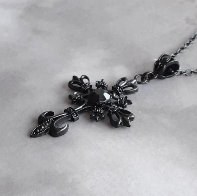 The cross is black plated metal alloy, approximately 3.5cm wide and 4.5cm high. The cross has an intricate filigree pattern, and a round faceted black stone set in the centre. It is attached to a patterned black bail, and hung from a black plated trace chain.