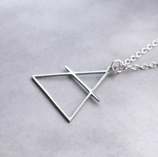 The triangle is stainless steel, almost 3cm wide and 2.5cm high. It is attached to a steel jumpring, and hung from a steel trace chain.