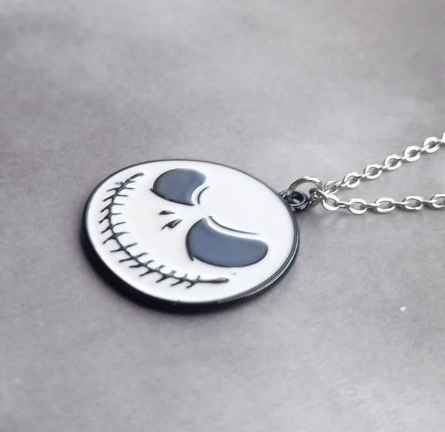 Smiling face of Jack Skellington, approximately 2.75cm in diameter. Made from a black metal alloy, with white enamel details. It is attached to a steel jump ring and hung from a stainless steel chain.