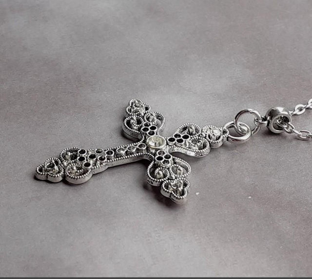 The cross is silver plated metal alloy, approximately 35mm wide and 50mm long. Designed with an intricate filigree pattern, it has a small faceted white stone in the centre. It is attached to a silver plated bail and hung from a stainless steel chain.