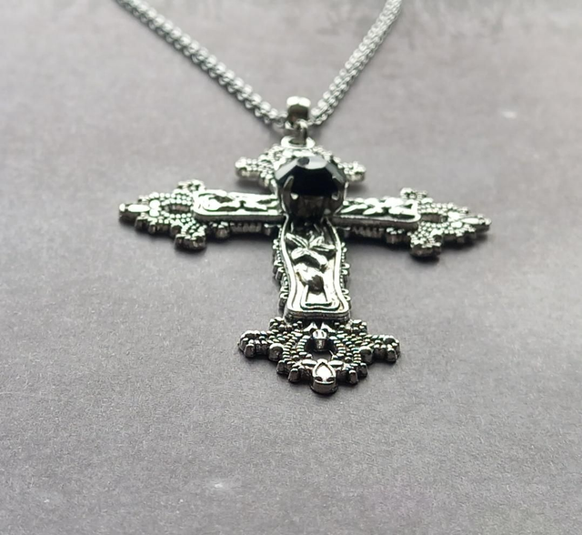 Large floral patterned metal cross necklace set with a central black acrylic stone.