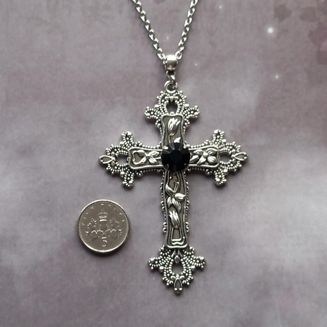 The cross is silver plated metal alloy, just over 5cm wide and 7cm long. It is attached to a simple silver plated bail, and hung from a stainless steel chain.