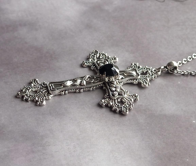 Flower Patterned Gothic Cross Necklace with Black Stone