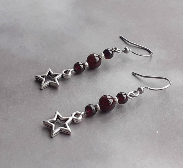 The cut-out stars are silver plated metal alloy, approximately 1cm wide and 1.5cm long. The round garnet beads above are 4mm and 6mm in diameter. Small glass beads separate the garnet beads.