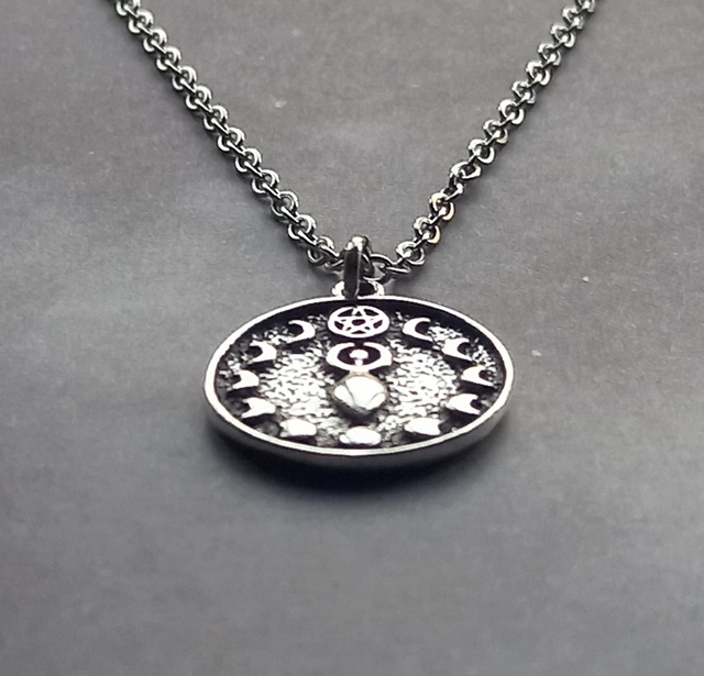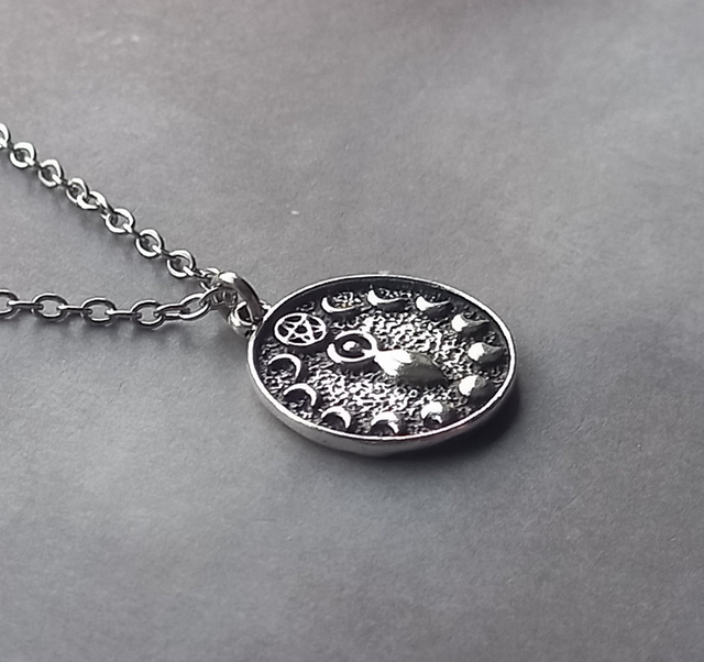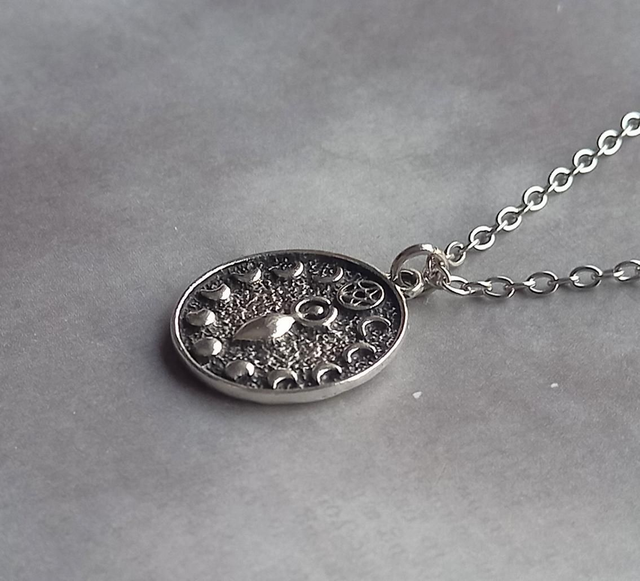 The circle is silver plated metal alloy, approximately 2cm in diameter. It is hung from a stainless steel chain.