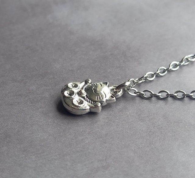 The cat is silver plated metal alloy, approximately 1cm wide and 1.5cm high. It is attached to a steel jumpring and hung from a stainless steel chain.
