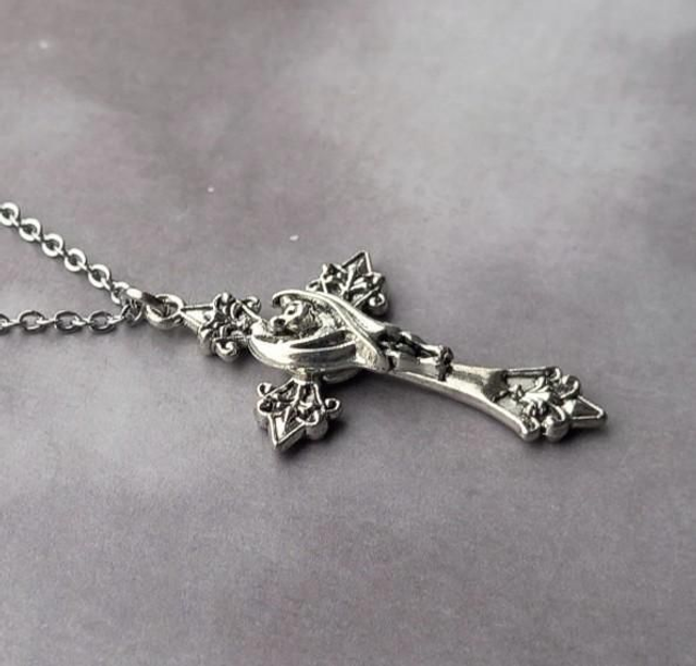 The bat is silver plated metal alloy, approximately 2.5cm wide and 4.5cm high. It is attached to a steel jumpring and hung from a stainless steel chain.