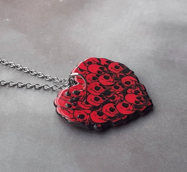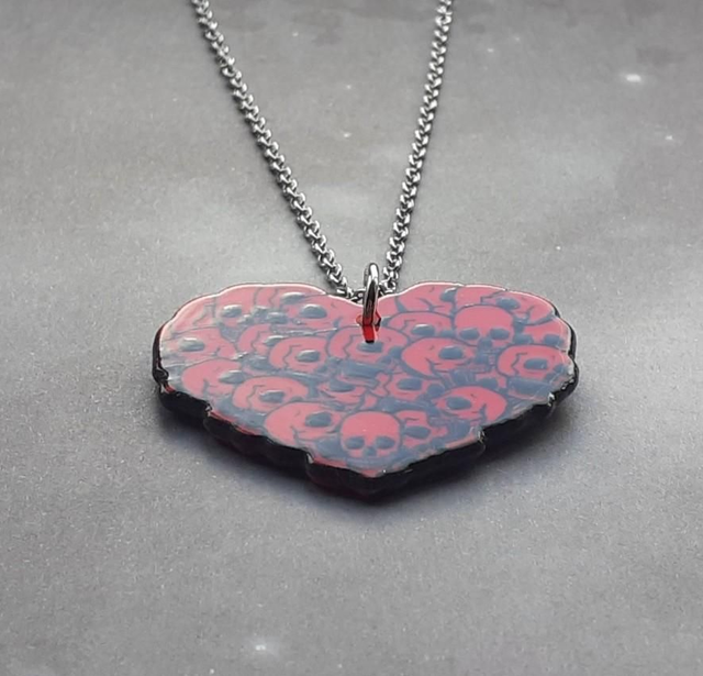 Acrylic heart shaped necklace covered with skull illustrations. It is double sided.