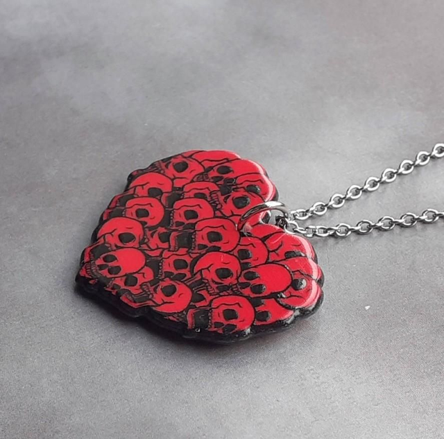 Acrylic heart shaped necklace covered with skull illustrations. It is double sided.