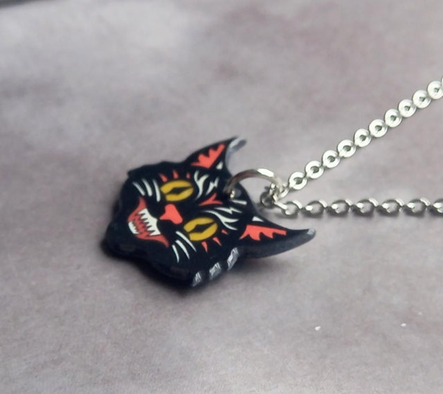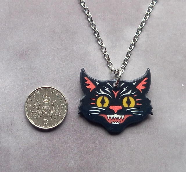 The cat's head is made from acrylic, and is approximately 3cm wide and 2.5cm high. It is attached to a jumpring and hung from a stainless steel trace chain.