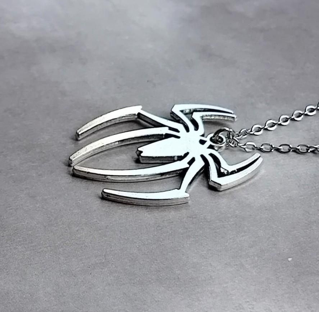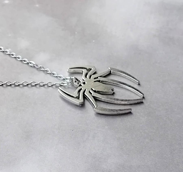 The spider is silver plated metal alloy, approximately 3cm wide and 4cm high. It is attached to a steel jumpring, and hung from a stainless steel chain.