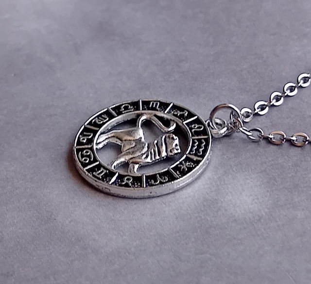 The circle is silver plated metal alloy, approximately 2cm in diameter. It is attached to a steel jumpring and hung from a stainless steel chain.