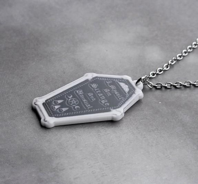 Acrylic coffin necklace with the Lydia quote 'I myself am strange and unusual'.
