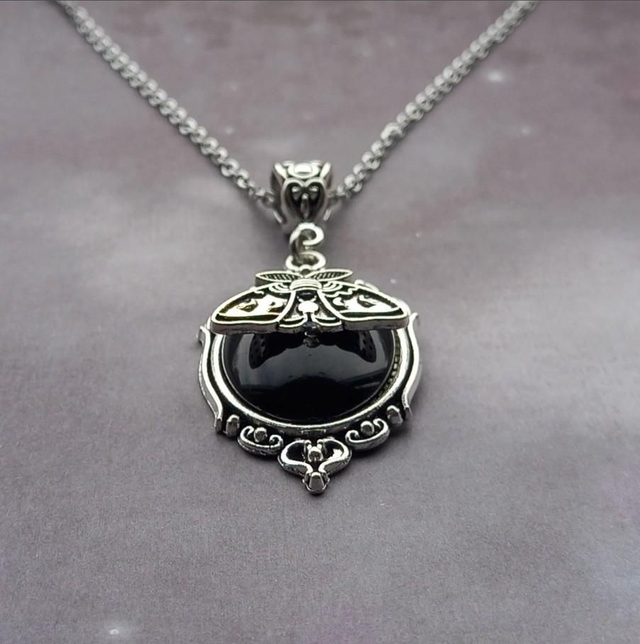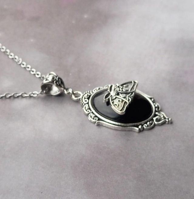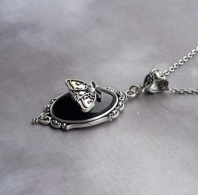Black cameo pendant with moth detail.
