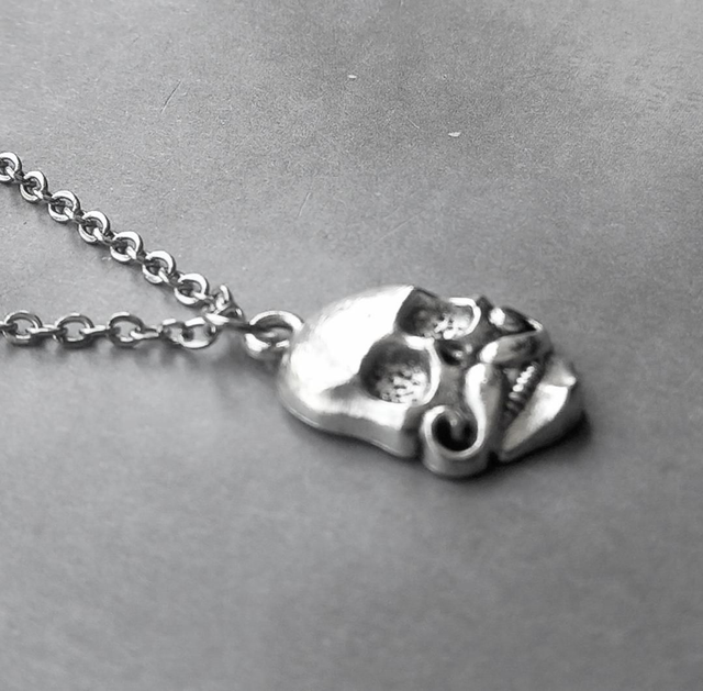 The skull is made from silver plated metal alloy, and is approximately 1.5cm wide and 2cm high. It is attached to a simple steel ring and hung from a stainless steel chain.