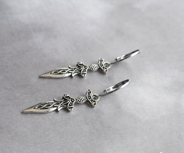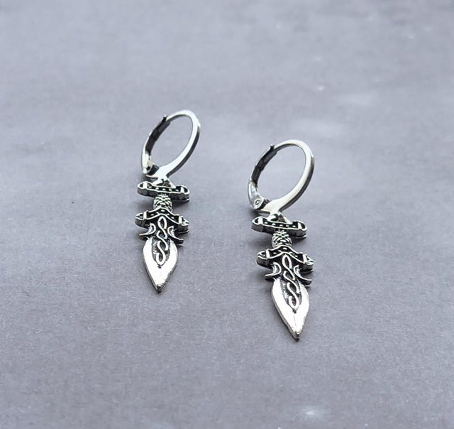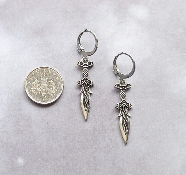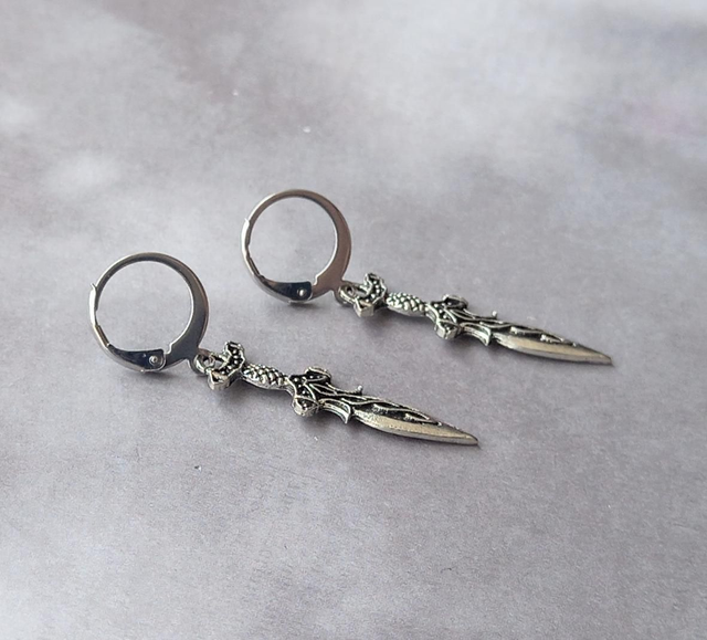 The daggers are silver plated metal alloy, approximately 1cm wide and 3cm long. They are attached to steel hinged mini hoops.