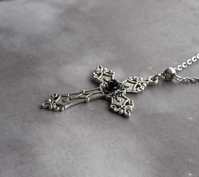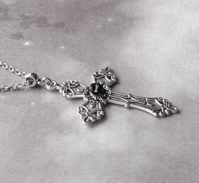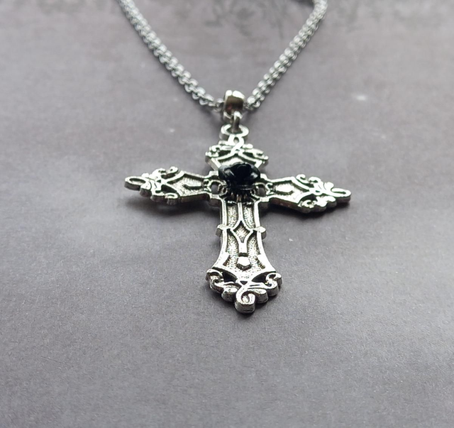 The cross is silver plated metal alloy, approximately 3.5cm wide and 5.5cm high. It is attached to a simple silver plated bail, and hung from a stainless steel chain.