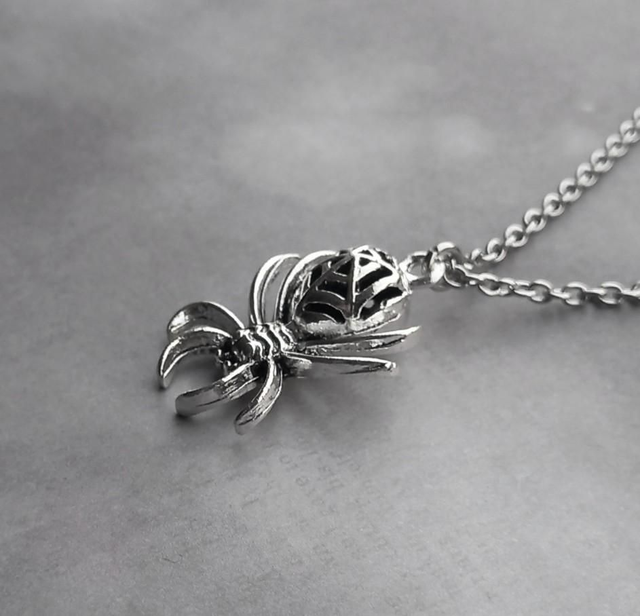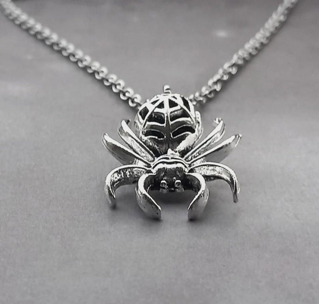 The spider is silver plated metal alloy, approximately 2cm wide and 3cm long. It is attached to a steel jumpring, and hung from a stainless steel chain.