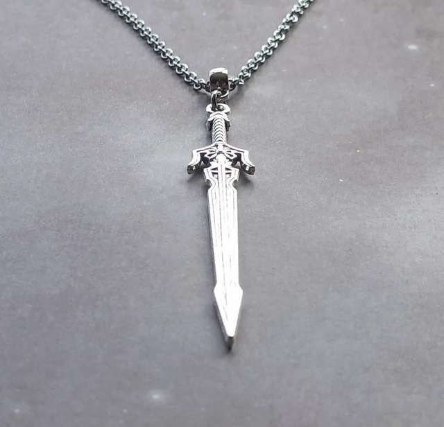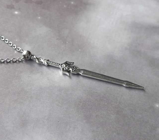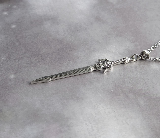 The sword is silver plated metal alloy, approximately 1cm wide and 7cm long. It is attached to a simple silver plated bail, and hung from a stainless steel chain.