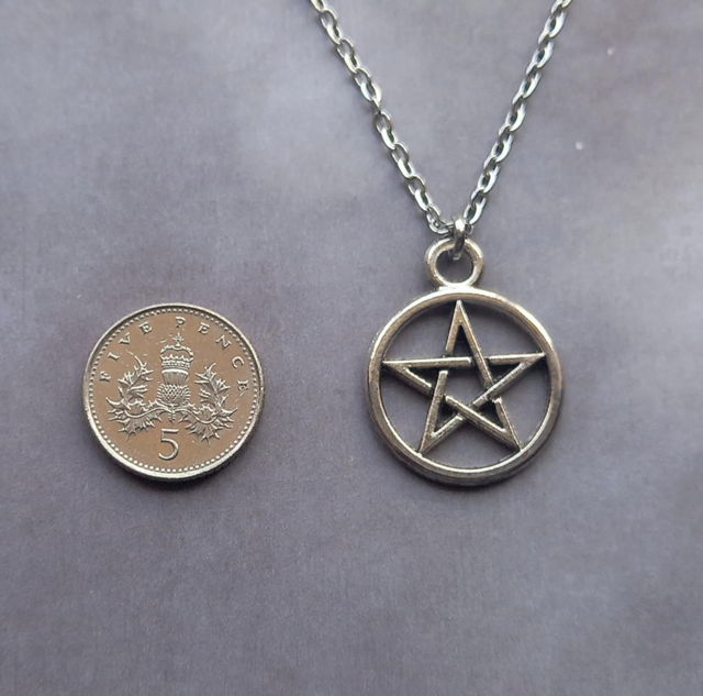 The pentagram is silver plated alloy, approximately 2cm in diameter. It is attached to a steel jumpring, and hung on a stainless steel chain.