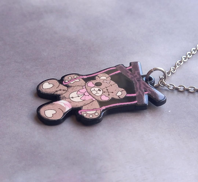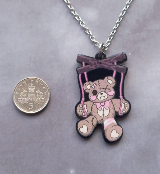 Puppet teddy acrylic necklace. This design is double sided.