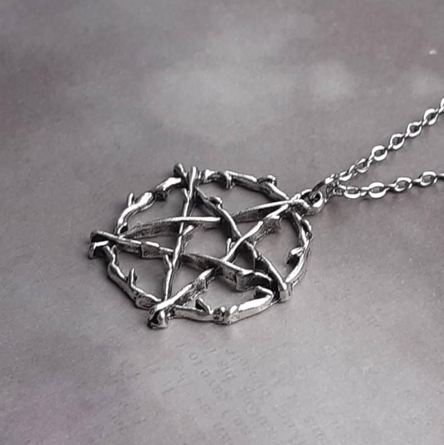 The pentagram is silver plated alloy, approximately 2.5cm in diameter. It is attached to a steel jumpring, and hung from a stainless steel chain.