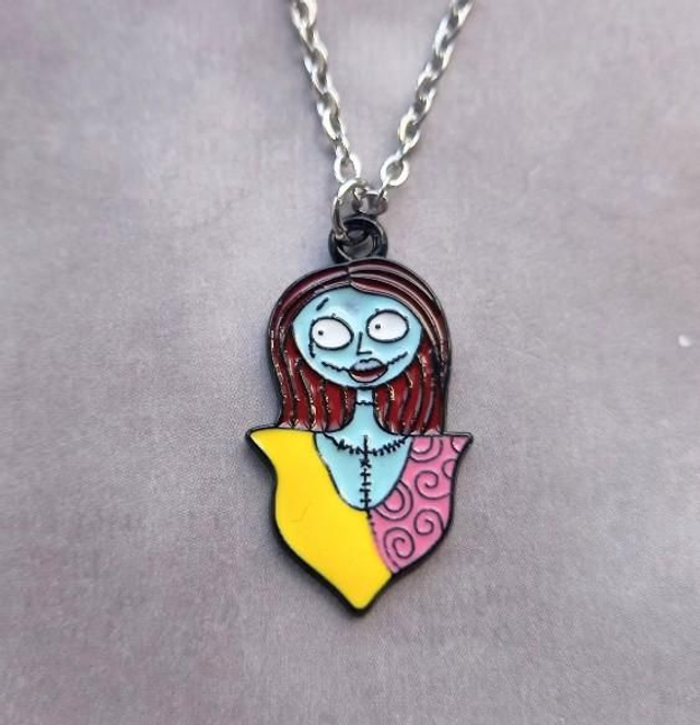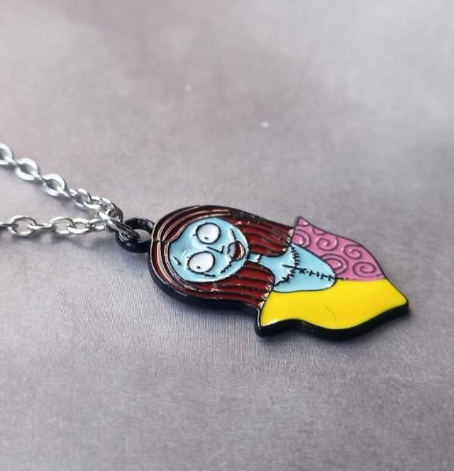 Head and shoulders of Sally, from the film 'Nightmare Before Christmas'. The character is black plated metal alloy, decorated with coloured enamel. It is approximately 1.5m wide and 3cm high. It is attached to a jumpring and hung from a stainless steel chain.