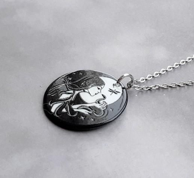 The circle is made from black and white acrylic, and is double sided. Measuring just over 3cm in diameter, it is attached to a jumpring and hung from a stainless steel chain. It fastens with a lobster clasp.